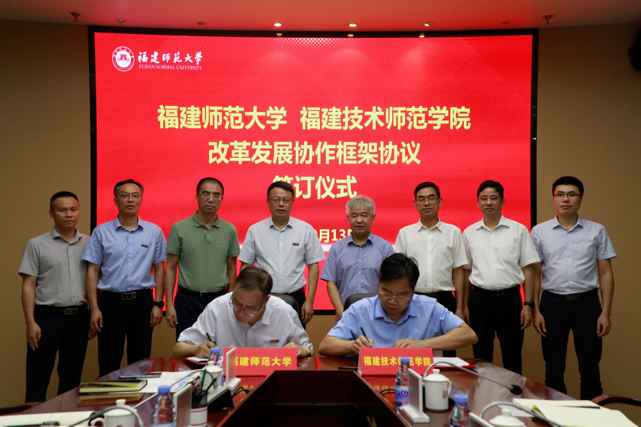 9月13日,福建师范大学、福建技术师范学院改革发展协作框架协议签订仪式在福建师范大学旗山校区举行。福建师范大学党委书记潘玉腾,我校党委书记赖海榕出席并致辞。福建师范大学校长王长平主持协议签订仪式。福建师范大学副校长郑家建,我校校长廖深基、副校长商光美出席会议,两校党政办公室、组织、人事、教务、规划、科研、财务等部门负责人参加会议。