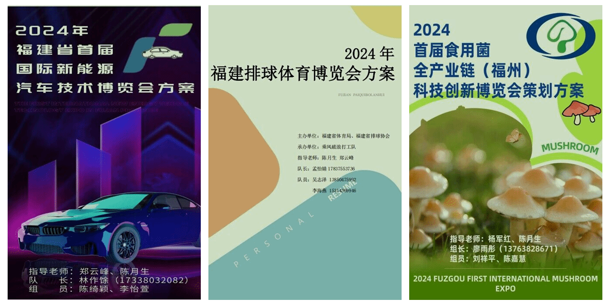 其中,“能源先锋队”以“2024年福建省首届国际新能源汽车技术博览会方案”荣获省赛一等奖,该团队成员为经济与金融专业的林作馀、陈绮颖、李怡萱同学,由郑云峰和陈月生老师指导;“乘风破浪打工队”以“2024年福建排球体育博览会方案”荣获省赛二等奖,该团队成员为经济与金融专业的孟怡婧、李海燕、吴志泽同学,由陈月生和郑云峰老师指导;“横扫千菌队”以“2024首届食用菌全产业链(福州)科技创新博览会方案”荣获省赛二等奖,该团队成员为国际经济与贸易专业的廖雨彤、刘祥平、陈嘉慧同学,由杨军红和陈月生老师指导。