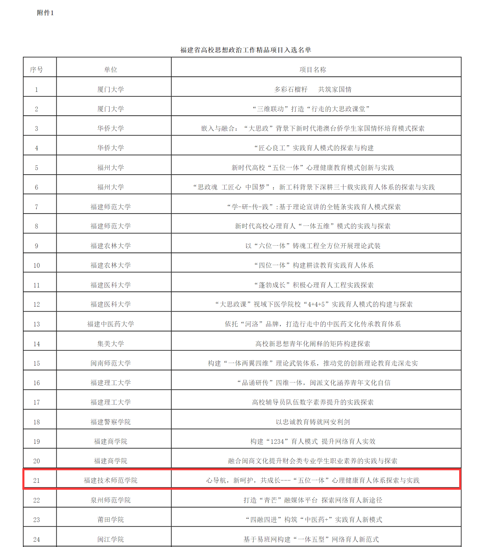 近日,福建省委教育工委公布2023年福建省高校思想政治工作质量提升综合改革与精品建设项目入选名单,我校学生工作部申报的《心导航,新呵护,共成长——“五位一体”心理健康育人体系探索与实践 》项目入选省高校思想政治工作精品项目。