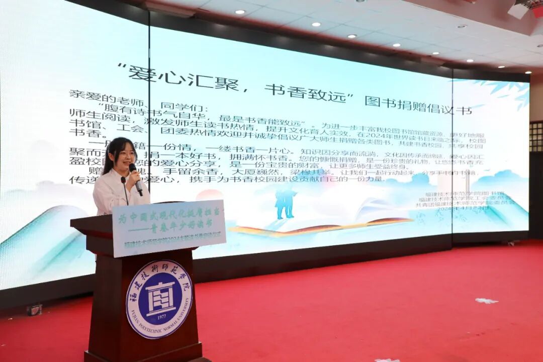启动仪式在雄壮的国歌声中拉开序幕。随后,团委、图书馆分别发布了“为中国式现代化挺膺担当——青春年少好读书”2024年主题读书季和“以文化人 阅见成长”读书节活动方案。学生代表宣读了由图书馆、工会、团委发起的“爱心汇聚 书香致远”图书馆捐赠倡议书。
