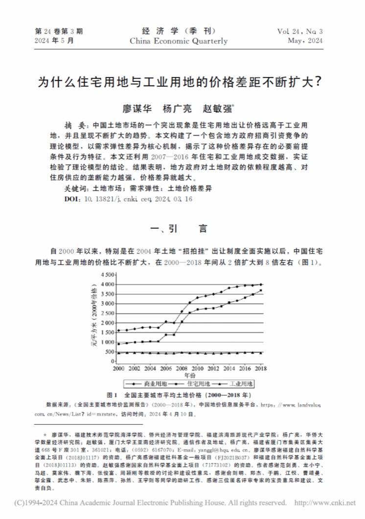 国内经济学顶级期刊之一《经济学(季刊)》于2024年第3期发表了我校海洋学院副院长、福建滨海旅游现代产业学院院长廖谋华博士为第一作者的合作论文《为什么住宅用地与工业用地的价格差距不断扩大?》。合作者为华侨大学数量经济研究院杨广亮副教授、厦门大学王亚南经济研究院赵敏强副教授。《经济学(季刊)》由北京大学主管、北京大学中国经济研究中心主办,影响因子达9.158。该刊同期第一作者单位有:北京大学、中国人民大学、中央财经大学、厦门大学、对外经济贸易大学、浙江大学、中山大学、西安交通大学、复旦大学、中南大学、中山大学等多所国内知名高校。