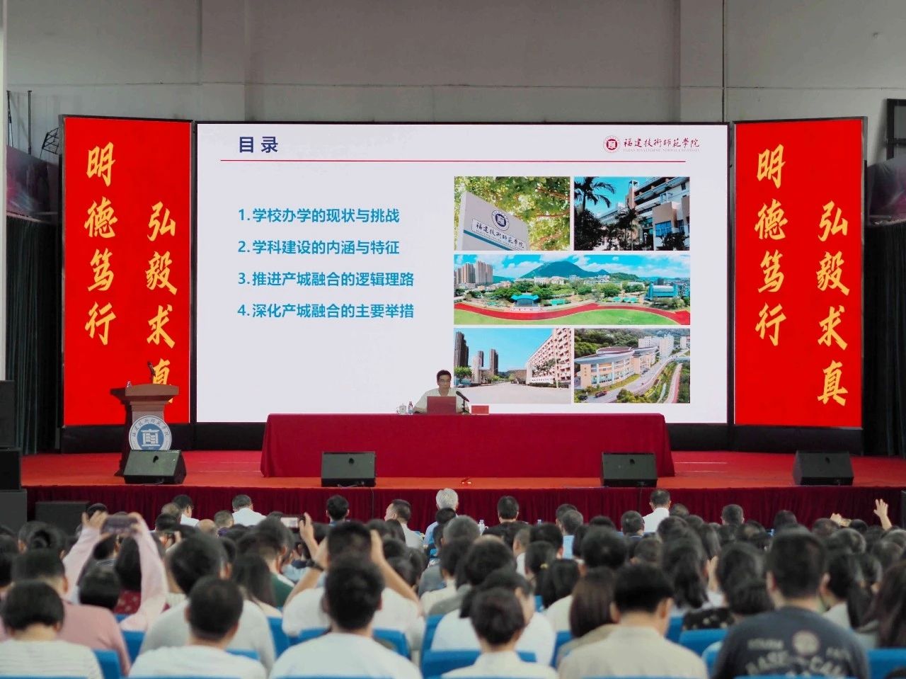 吴克寿校长作题为《产城融合 聚沙成塔》的主题报告。他系统梳理了学校办学规模、本科专业建设、科研平台建设、人才培养与就业情况、师资队伍、财务收支等办学关键指标,全面分析和研判当前学校存在的问题与短板、遇到的困难与挑战,重点阐述了学校学科建设发展的方向,阐明了学校办学思路和发展目标。他指出,当前是学校开启学科建设发展新篇章的关键时期。要抓住学科规划、学科队伍、学科平台、学科项目、学科环境等关键要素,系统开展学科建设。他强调,服务福清发展,推进产城融合是学校推进学科建设的重要抓手,要找准五个“结合点”,着力打造四个“一批”成果,成为城市产业升级的创新源、科学治理的智慧库、文化软实力的塑造者和人力资源的蓄水池,将学校办成福州福清市委市政府和全市人民“想得起、用得上、靠得住、离不开、信得过”的高水平大学。