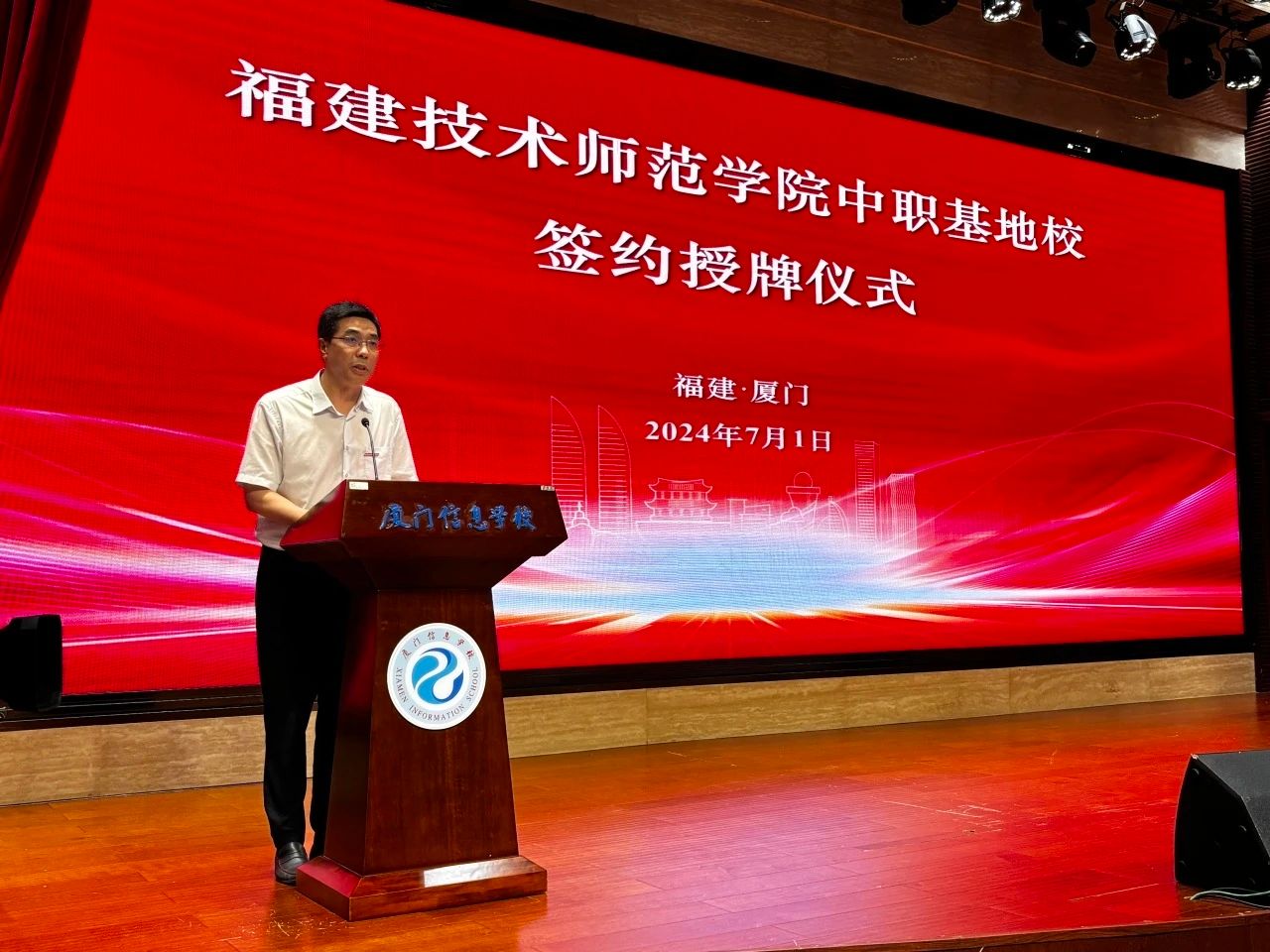 我校党委副书记、校长吴克寿在致辞中表示,作为福建省唯一一所定位培养职教师资的本科高校,福建技术师范学院主动承担服务和引领福建职业教育高质量发展的历史重任,在福建省教育厅的大力支持下,在服务和推动我省建设具有福建特色现代职业教育体系方面进行了积极的探索和实践。共建福建技术师范学院中职基地校厦门信息学校、厦门市集美职业技术学校,是贯彻落实习近平总书记关于职业教育的重要论述,深入推进职业教育育人方式、办学模式改革的生动实践,是统筹优质资源推动福建职业教育提质培优、加快构建特色现代职业教育体系的重要举措,也是学校支持厦门市职业教育高质量发展的具体行动。学校将充分发挥学科、人才、平台等资源优势,指导和支持基地校厦门信息学校、厦门市集美职业技术学校加快高质量发展,着力打造具有创新性、示范性、引领性的职业教育发展模式。