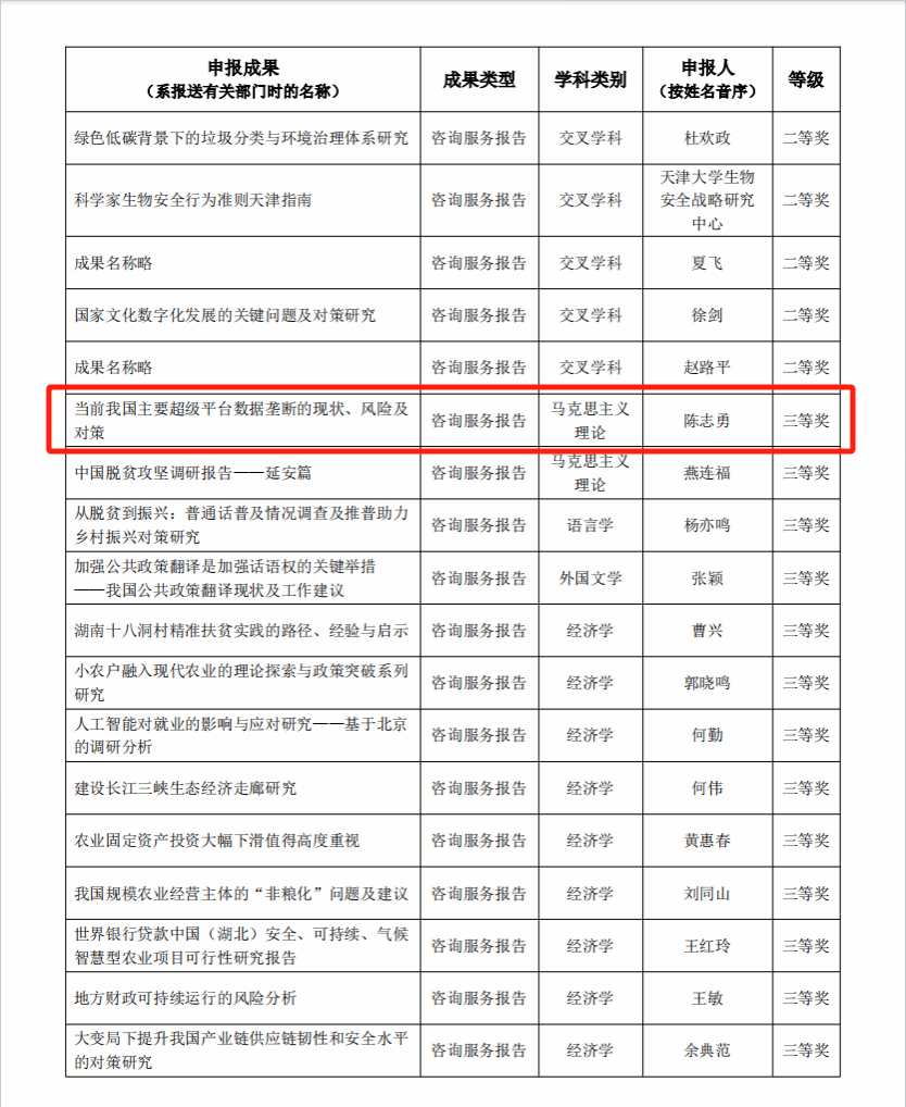 近日,教育部公布第九届高等学校科学研究优秀成果奖(人文社会科学)评选结果。我校陈志勇教授的咨询服务报告《当前我国主要超级平台数据垄断的现状、风险及对策》荣获三等奖。