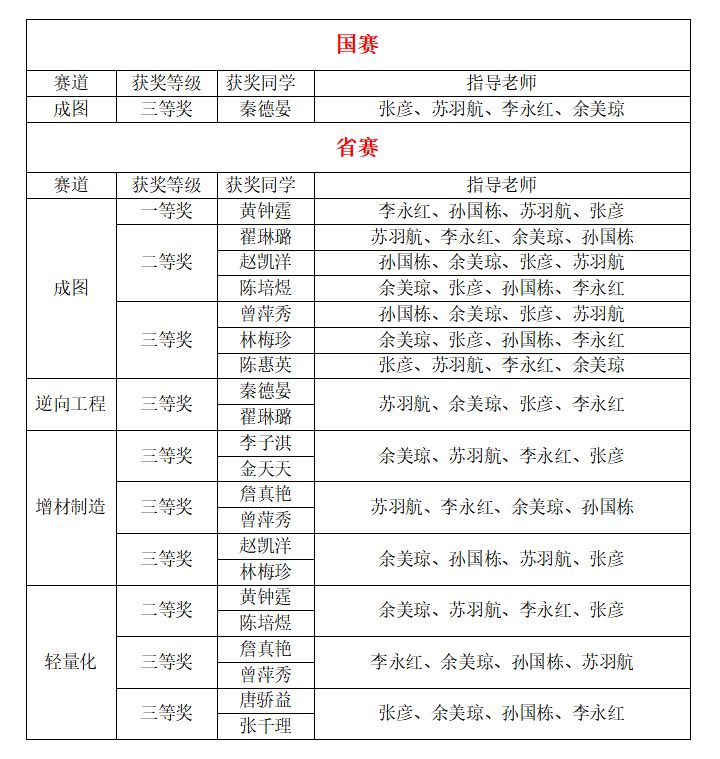 此前,在福建省赛决赛中,我校材料与包装工程学院代表队斩获先进成图技术赛道个人赛一等奖1项、二等奖3项、三等奖3项,逆向工程赛道团体三等奖1项,增材赛道团体三等奖3项,轻量化设计赛道团体二等奖1项、三等奖2项。