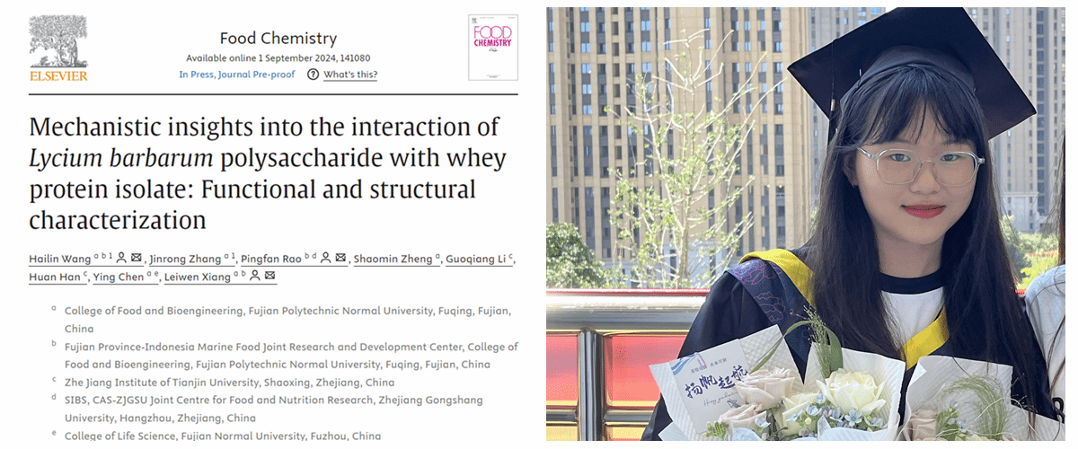 近日,我校食品与生物工程学院食品科学与工程专业2020级本科毕业生张锦蓉在校期间以共同第一作者身份撰写的论文“Mechanistic insights into the interaction of Lycium barbarum polysaccharide with whey protein isolate: Functional and structural characterization”在食品科学领域国际学术期刊《Food Chemistry》(中科院1区TOP,IF: 8.5)发表,我校为第一署名单位。这是我校首次以本科生为第一作者在国际SCI期刊上发表论文,是我校本科生人才培养质量进一步提升和学科专业建设的标志性成果。