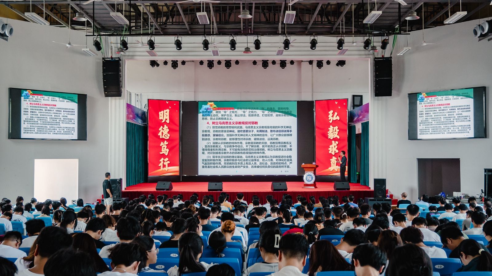 为进一步普及反邪知识,增强我校广大师生的防范意识,9月12日上午,我校党委统战部与福清市委政法委、市委统战部(民宗局)、市公安局在石竹山校区学生活动中心开展“平安反邪进校园”防范邪教宣传教育活动。活动邀请福州市反邪教协会副会长李明耕为我校大数据与人工智能学院、电子与机械工程学院全体2024级新生作了题为《树立马克思主义宗教观,抵御邪教向校园渗透》的讲座。福清市与我校相关部门负责人出席本次活动。