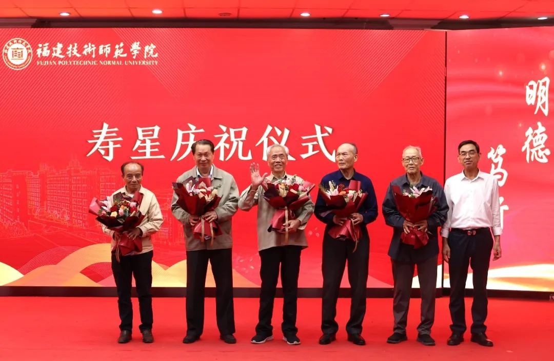 在活动仪式上,商光美副校长为3对金婚夫妇代表和70周岁、80周岁的13位寿星代表送上鲜花和祝福,与代表们亲切交谈并合影留念。钻石婚金婚代表陈文泉、寿星代表赖烺秋先后发言。