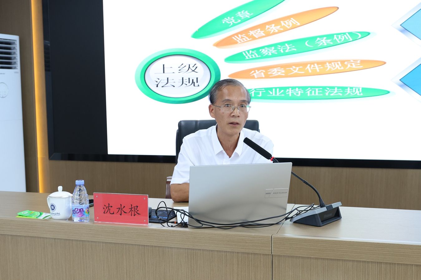 培训班邀请了省纪委监委第三纪检监察室副主任许荣标以及福建理工大学纪委委员、纪检监察室主任、党委巡察办主任沈水根作辅导报告,并组织观看了警示教育片。