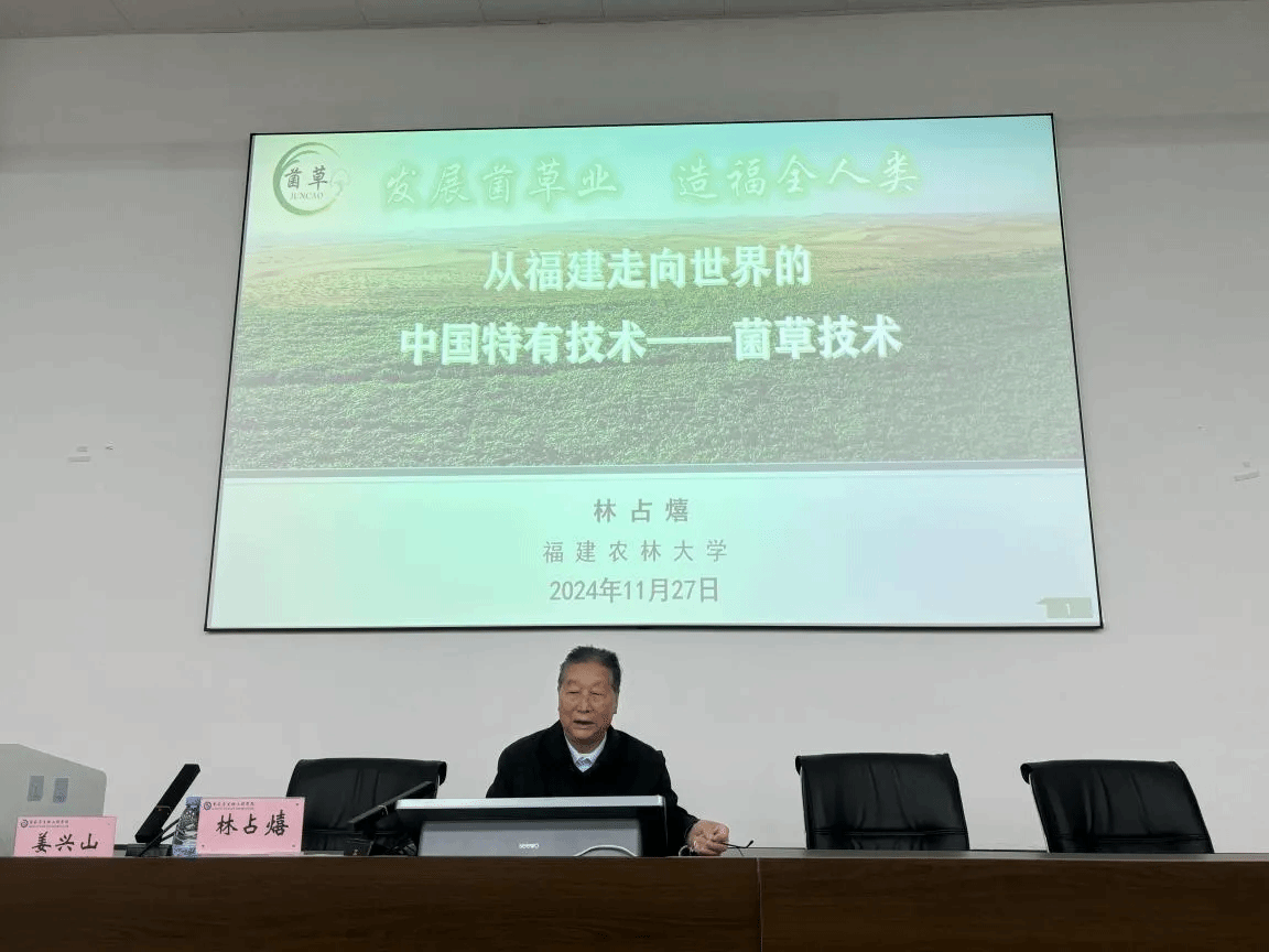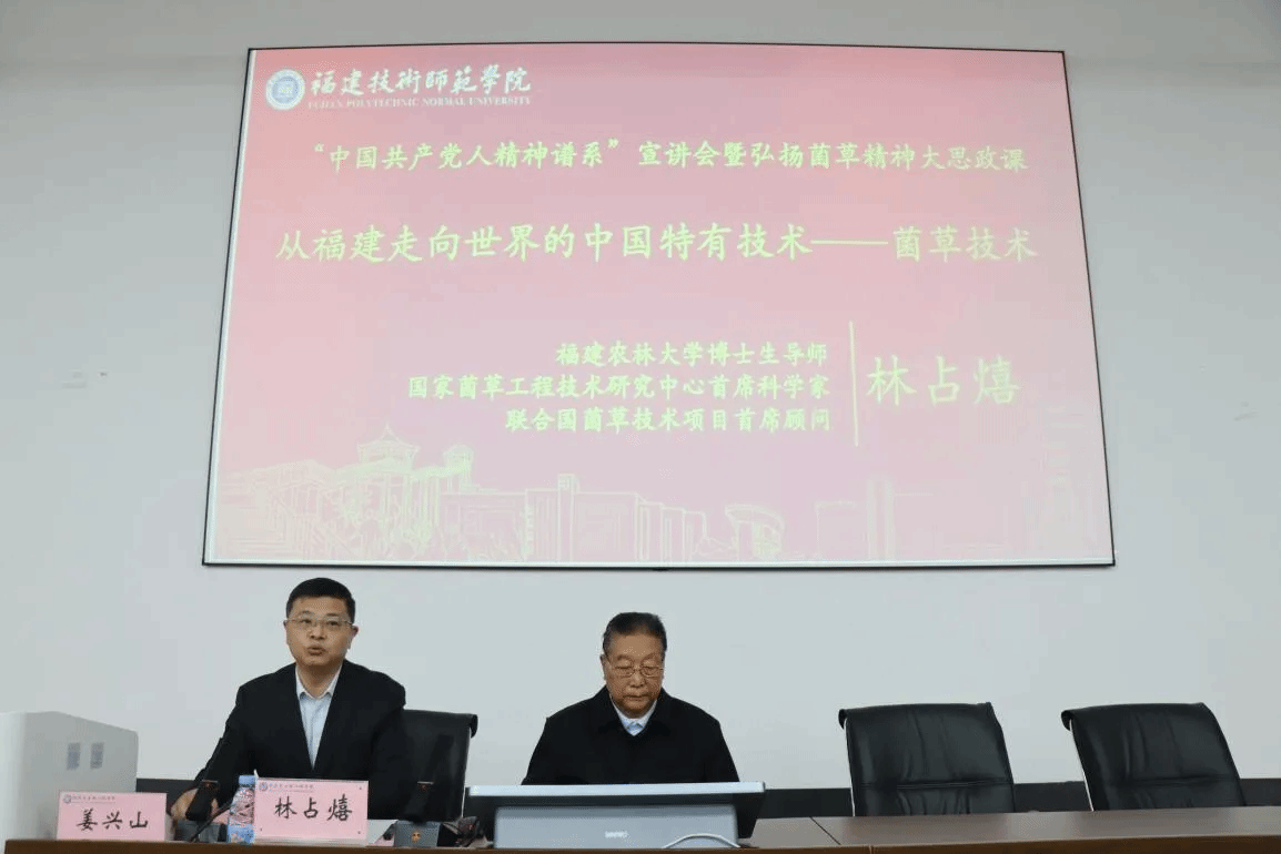 在中国共产党人精神谱系宣讲会暨弘扬菌草精神大思政课上,林占熺教授围绕“从福建走向世界的中国特有技术——菌草技术”的主题,在向高园报告厅(一)为师生作了精彩报告。报告会由副校长姜兴山主持。食品与生物工程学院、马克思主义学院近300名师生代表到场聆听。