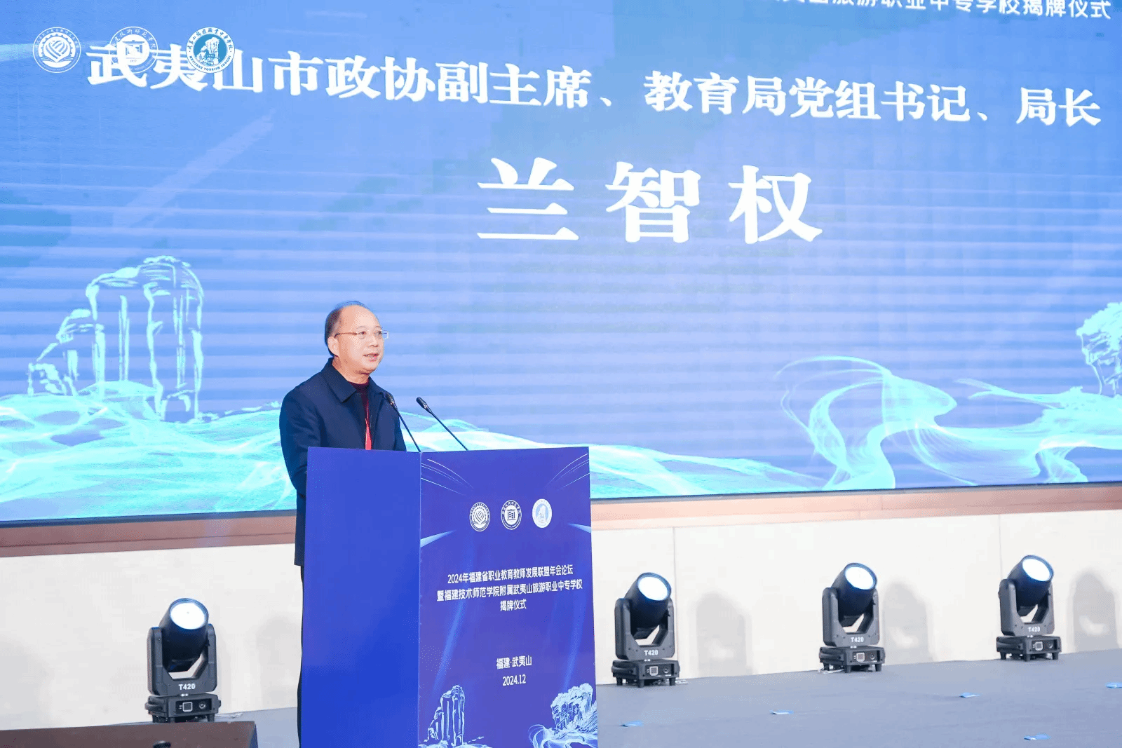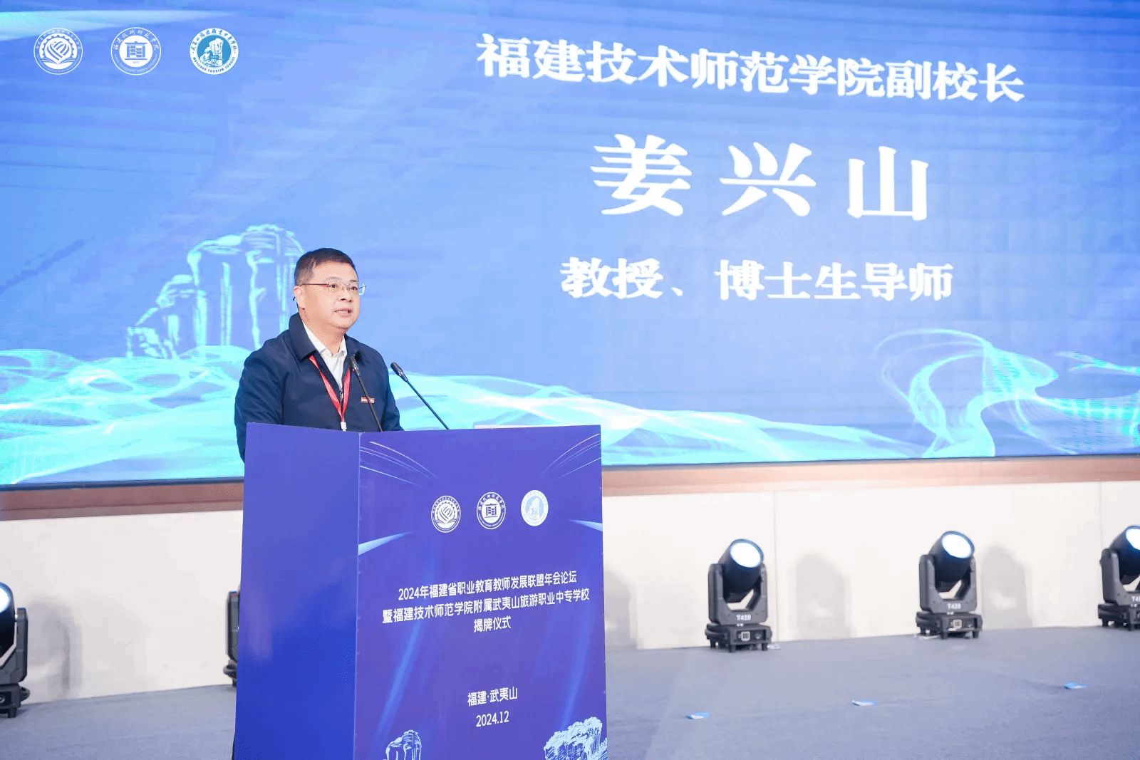 12月30日,2024年福建省职业教育教师发展联盟年会论坛暨福建技术师范学院附属武夷山旅游职业中专学校揭牌活动在武夷山市举行。副校长姜兴山,南平市教育局副局长黄小青,武夷山市政协副主席、教育局党组书记、局长兰智权,武夷山旅游职业中专学校党总支书记林谋清及校长吴应辉等领导出席活动。省内外职业教育研究专家代表、福建省职业教育教师发展联盟会员单位代表、我校附属校基地校代表、职业院校代表、企业嘉宾等参加了有关活动。