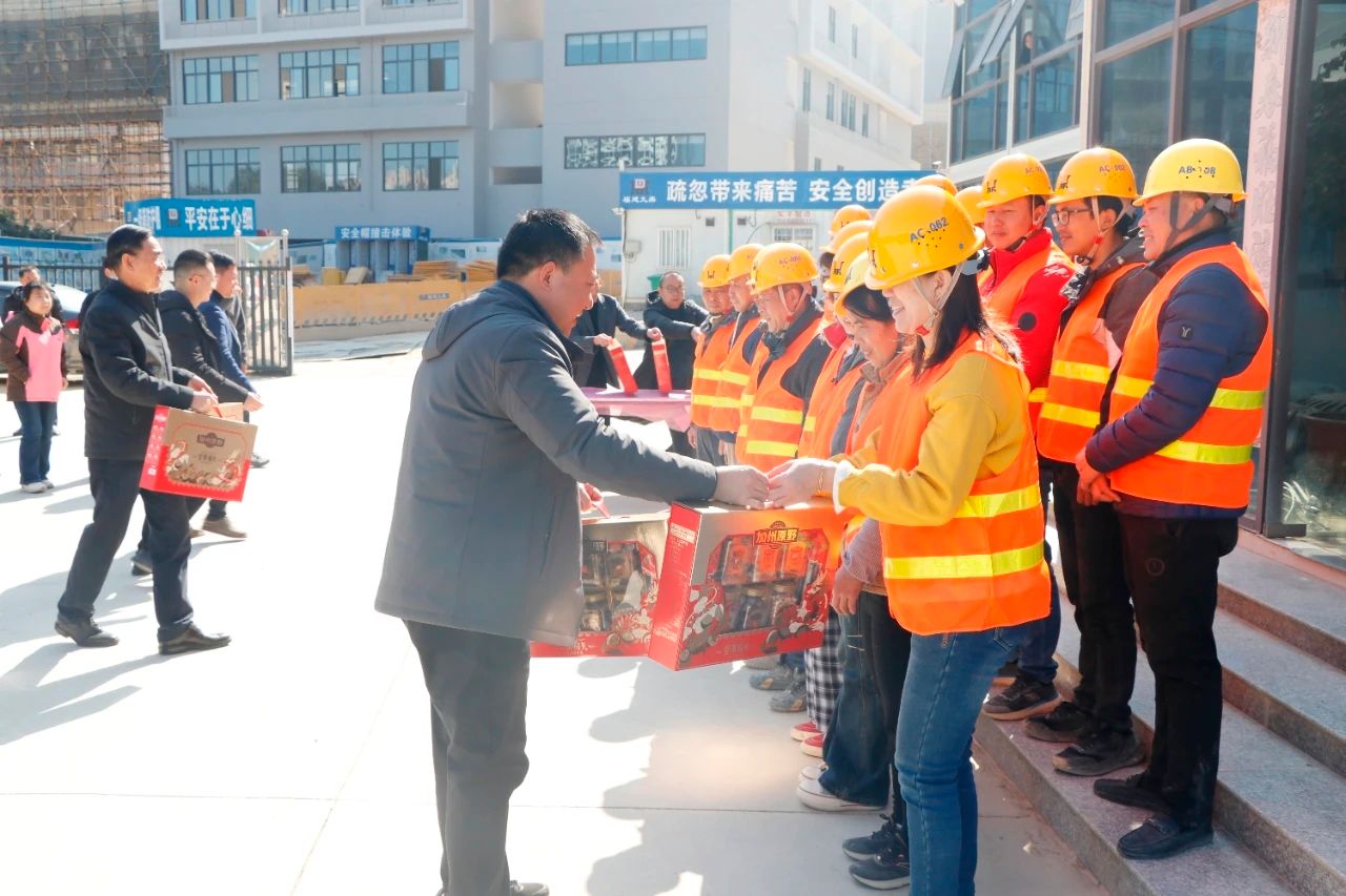 涂荣、商光美等将慰问品送至每一位工人手中,叮嘱大家在紧张工作的同时,一定要注意身体,做好冬季施工保暖和安全防护措施。
