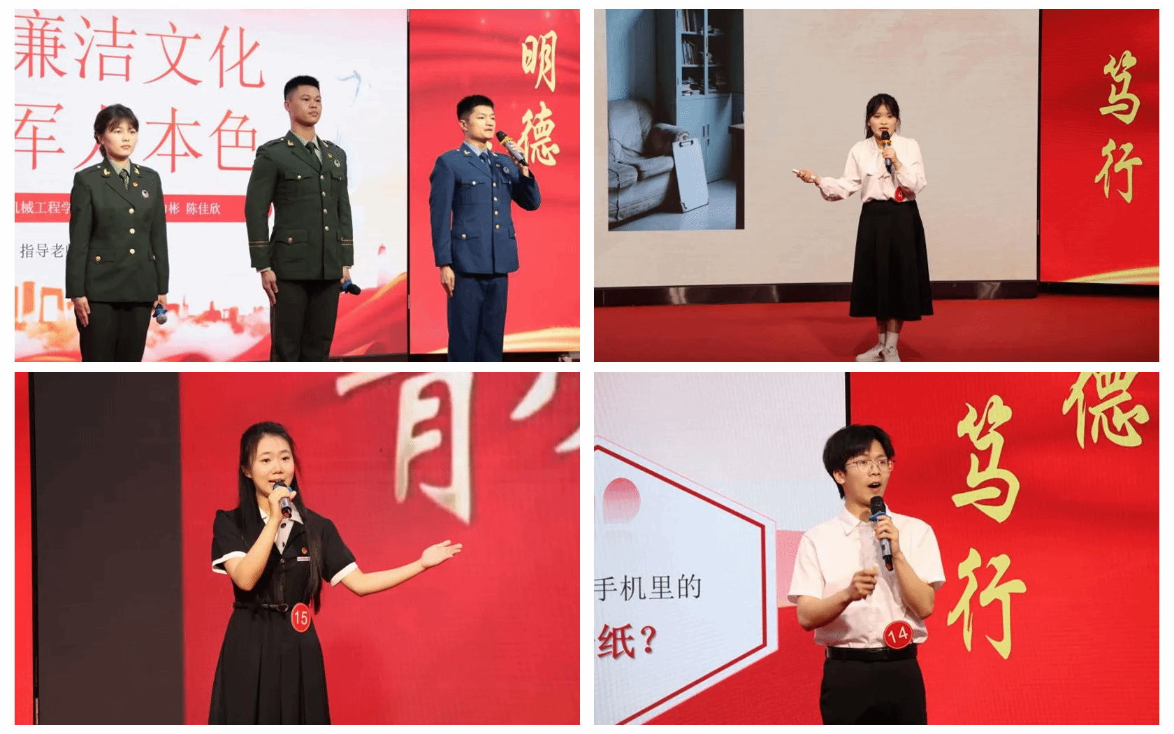 经过各学院推荐、初赛选拔,共有15组选手脱颖而出进入决赛。“包拯不执一砚显清风,海瑞备棺上万言书,清风正气蕴藏在中华优秀传统文化中。” “一支粉笔、两袖清风、三尺讲台,担起的是育人之责,书写的是师者清廉风范。”“我们的青春与清廉共舞,让红色江山永不褪色。” ……选手们聚焦“青年说廉”的主题,用饱含激情、掷地有声的“廉言廉语”,生动诠释了廉洁文化的厚重历史底蕴和强大时代魅力,深刻阐述了廉洁文化对青年成长的重要意义。