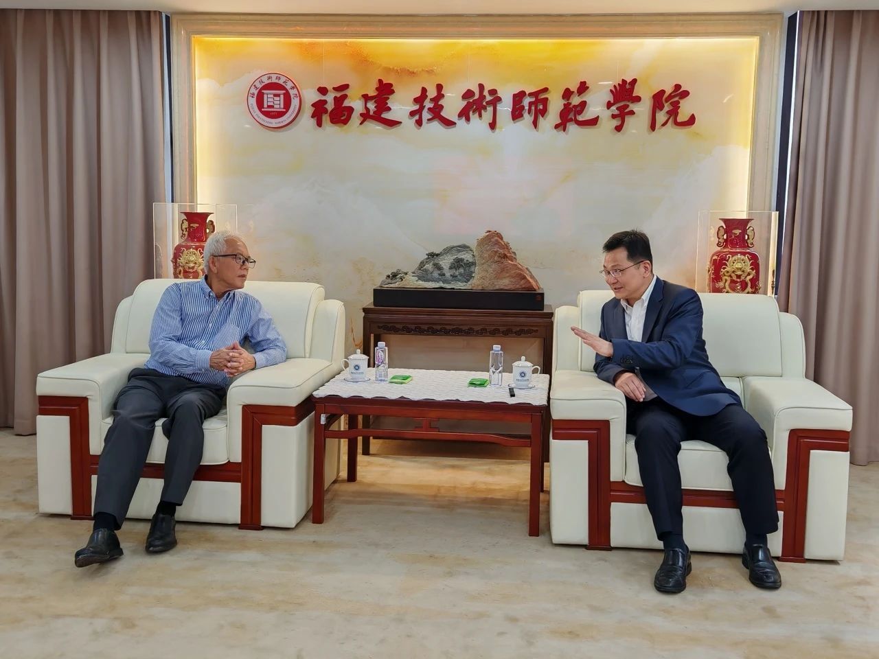 林海峰在五马山校区林联兴科技楼临风厅会见郑泽民一行。他详细介绍了学校的办学历程、校区建设、学科专业设置、校园文化以及印尼留学生教育等近期发展情况,重点阐述了印尼留学生教育成果及未来发展规划。他指出,学校依托福清作为“两国双园”重要承载地和食品产业高地的区位优势,深化印尼留学生教育,既是服务地方经济、打造办学特色的重要举措,更是搭建中印尼青年交流平台、促进双边合作共赢的务实行动。他希望以此次交流为契机,进一步扩大与印尼华侨的交流,加强双方的相互了解,在教育、文化等领域开展更多务实合作,推动印尼留学生教育迈向新高度。
