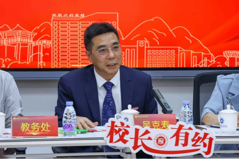 吴克寿首先向同学们介绍了学校校情和学校近期取得的主要成绩,带领同学们全面认识学校的发展定位、转型实践和办学特色,坚定发展信心。他表示,学校在加快发展的过程中,始终坚持以生为本的办学理念,着力打造更加宜居宜学的发展空间,致力于为同学们健康成长提供更加坚实的保障。他鼓励同学们畅所欲言,积极为学校事业发展建言献策。