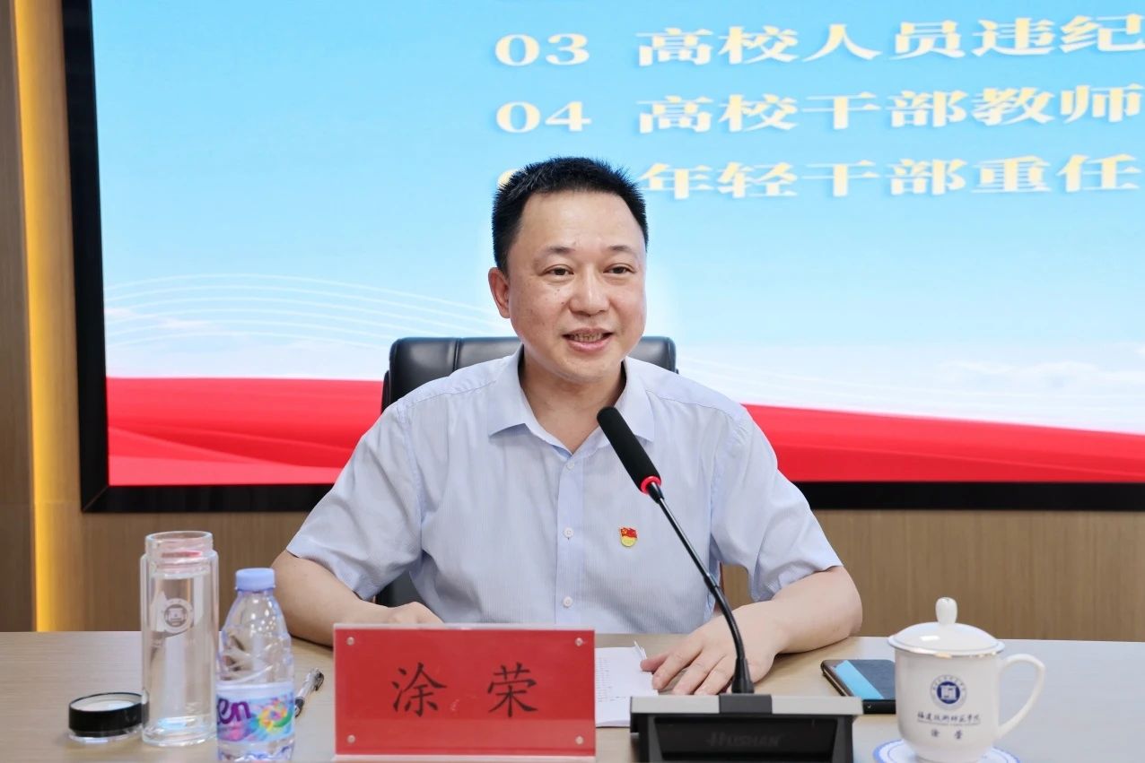 涂荣通报了近年来高校人员违纪违法典型案例,希望年轻干部教师知敬畏、存戒惧、守底线,时刻拧紧理想信念这个“总开关”,切实增强加强作风建设的政治自觉、思想自觉和行动自觉。