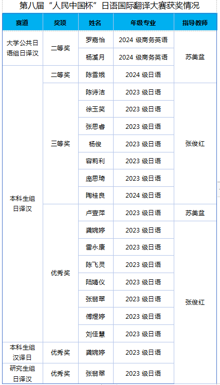 在第八届“人民中国杯”日语国际翻译大赛中,20名学子荣获奖项,其中获二等奖3人、三等奖7人、优秀奖10人。