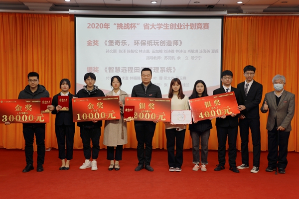 赖海榕书记、廖深基校长分别为获得2020年“挑战杯”大学生创业计划竞赛校赛优秀组织奖的单位,以及省赛金、银、铜奖学生团队和优秀指导老师颁奖。