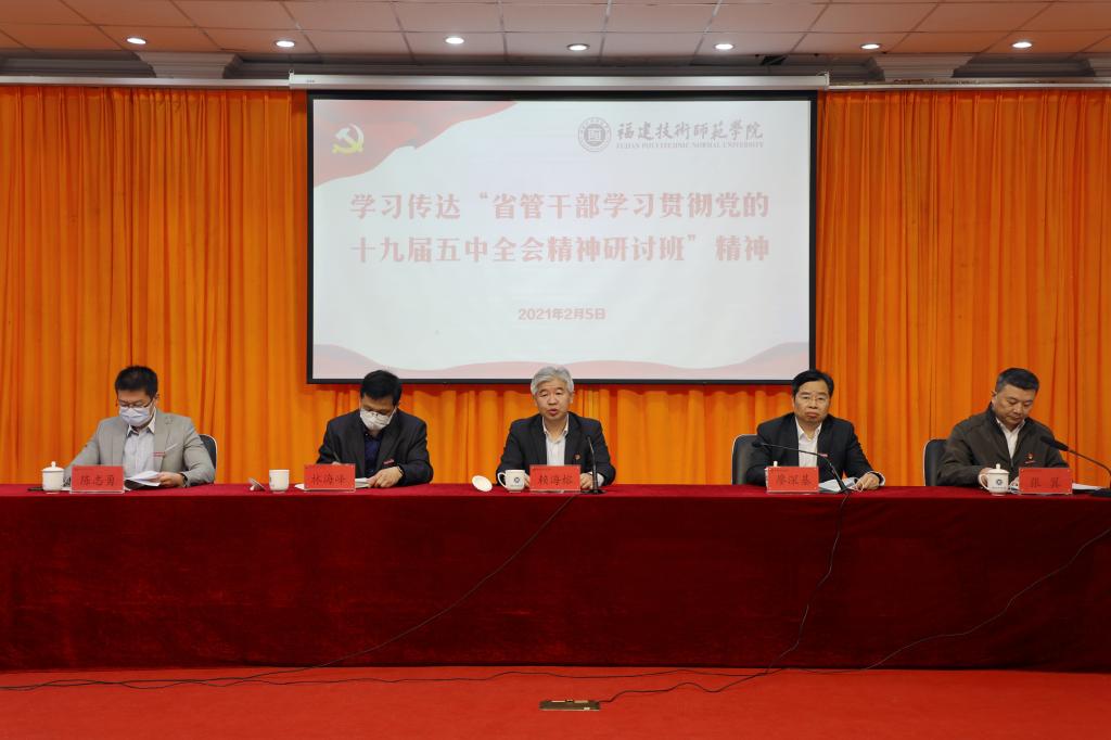 2月5日上午,我校在科学楼学术报告厅召开干部会议,传达学习省管干部学习贯彻党的十九届五中全会精神研讨班精神,研究部署我校“再学习、再调研、再落实”活动。校党委书记赖海榕主持会议,校领导廖深基、林海峰、张翼、陈志勇,校改革与发展委员会委员,以及各二级单位主要负责人参加了会议。