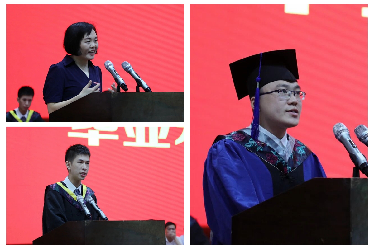 教师代表、经济与管理学院教授魏秀华,本科毕业生代表、2017级电子信息科学与技术专业洪景山,硕士毕业生代表、2018级食品生物化学工程专业柴小岩分别作了热情洋溢的发言。