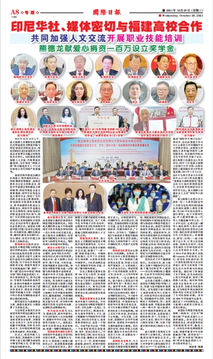 10月18日上午,我校通过视频连线方式与印尼福建社团联谊总会、印尼《国际日报》报业集团签署合作备忘录,并敦聘美国纽约大学哲学博士俞文娟为客座研究员。印尼《国际日报》董事长熊德龙捐资100万元人民币在我校设立“熊德龙奖学金”。此次活动得到了海内外媒体的广泛关注和报道,引发强烈的社会反响。