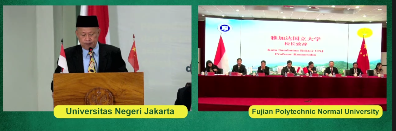 廖深基校长介绍了我校基本办学情况。他表示,福建技术师范学院坐落于中国著名侨乡、中国-印尼“两国双园”项目中方园区所在地——福建省福清市,与印尼高校开展教育合作是我校的光荣使命。他指出,印尼雅加达国立大学的学科布局与我校高度契合,两校之间具有紧密合作的坚实基础。两校签署协议备忘录将有助于推动双方在师生交流、人才培养、科学研究等方面的合作,促进两校师生共同成长和进步。他希望两校加强沟通联系,共同落实好协议内容,推动备忘录转化为积极成果,为促进中印尼两国合作交流作出贡献。
