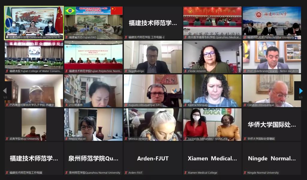 本次会议旨在推动福建省与巴西塞阿腊州高等教育合作,促进中国和巴西教育界加强交流互鉴、扩大共识和增进友谊,创造更深入的交流和合作机会。塞阿腊州科学技术与高等教育厅厅长伊纳西奥·阿胡巴、中等与职业教育厅副厅长茹西内德·费尔南德斯、塞阿腊州有关高校代表、中国驻累西腓总领馆总领事严宇清、福建省省外办副主任黄劭蓉、教育厅副厅长王飏,以及包括我校在内的省内十余所高校代表参加了视频交流会。