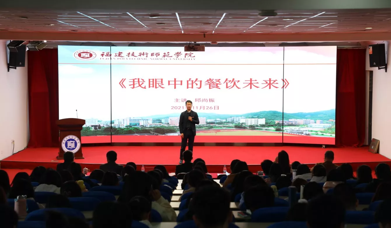 签约仪式之后,邱尚振董事长以《我眼中的餐饮未来》为主题,为临家餐饮现代产业学院开讲第一课。邱董事长详细分析了餐饮业现状,研判餐饮业未来发展趋势,并与师生们分享了他经营餐饮业的理念和心得。