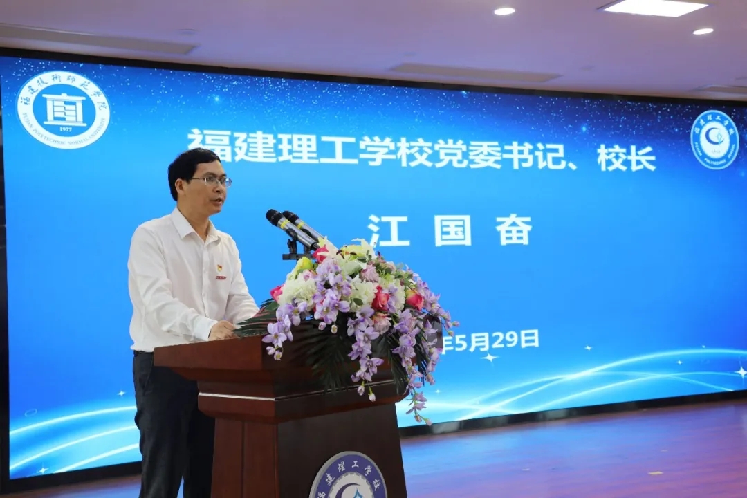 福建理工学校党委书记、校长江国奋致辞。他表示,福建理工学校有幸作为福建技术师范学院的中职基地校,将在福建技术师范学院大力指导和帮助下,围绕“机制创新、特色打造、名师培育、人才培养”等方面深化改革实践,突出“党建引领、一体贯通”、“双师”培育、“思政融入、产教融合、课证融通”、“畅通技术技能人才成长通道”等,积极探索职业教育类型发展新路子,更好服务区域经济社会发展。