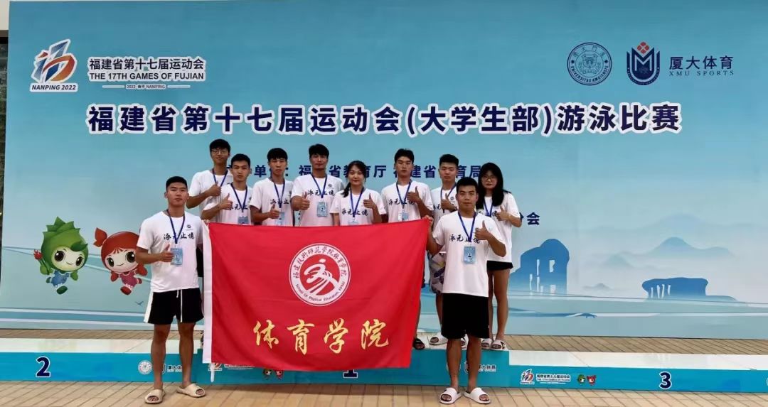 在福建省第十七届运动会(大学生部)乙组(普通高校体育学院组)游泳比赛中,我校游泳代表队摘得银牌3项、铜牌4项、第四名3项、第五名2项、第六名4项、第七名2项的好成绩,并荣获乙组团体总分第四名、乙组男子团体总分第二名。代表队由李凤成担任领队、吴立冬担任教练。