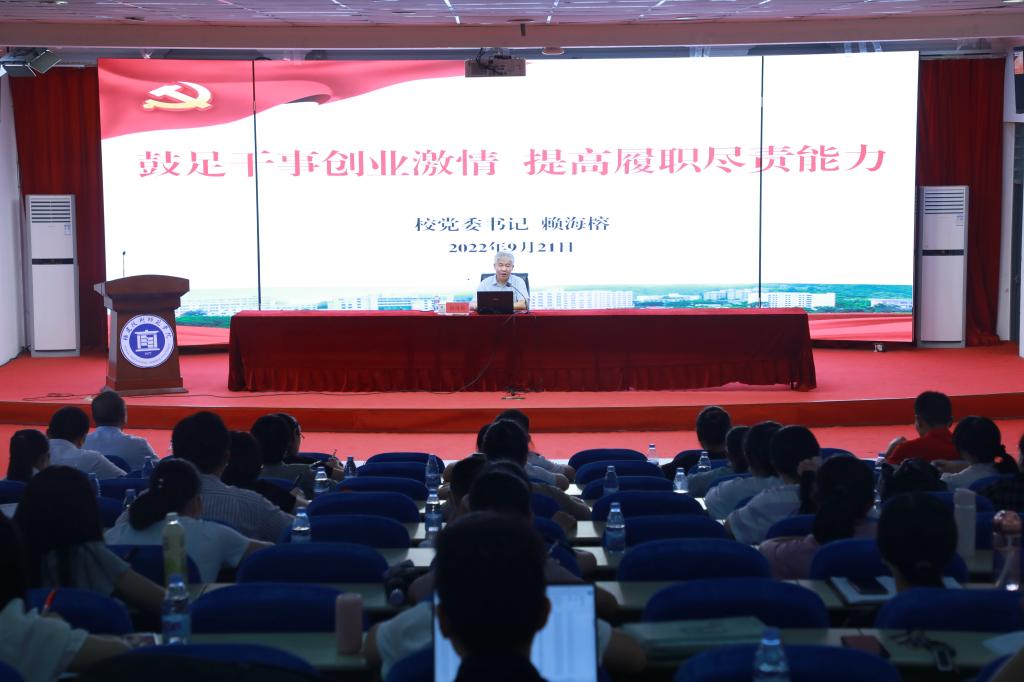9月21日下午,校党委书记赖海榕在五马山校区科学楼学术报告厅,以“鼓足干事创业激情 提高履职尽责能力”为题,为全校科级干部和辅导员讲授了一堂生动的党课。校党委组织部主要负责人主持了报告会。