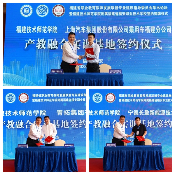 校党委副书记林海峰代表福建省职教师资培训中心分别与上海汽车集团股份有限公司乘用车福建分公司、青拓集团有限公司、宁德长盈新能源技术有限公司签订产教融合实训基地。