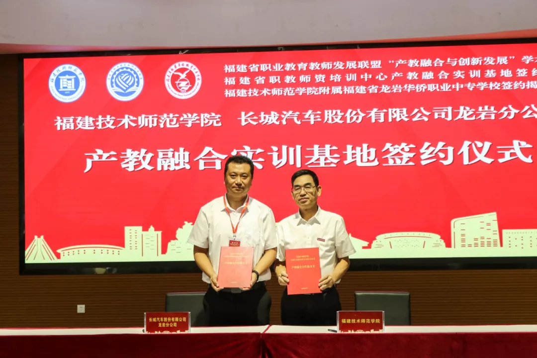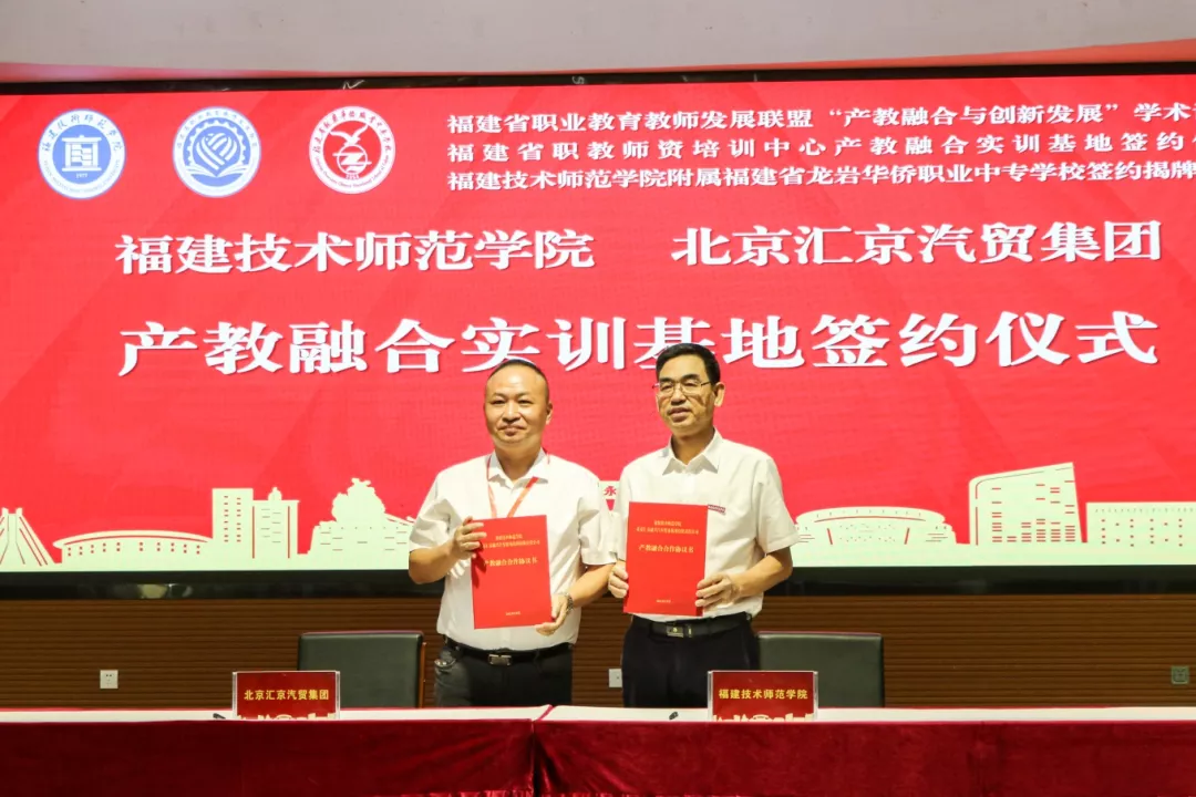 商光美副校长代表福建省职教师资培训中心分别与北京汇京汽贸集团、长城汽车股份有限公司龙岩分公司签订产教融合实训基地协议。
