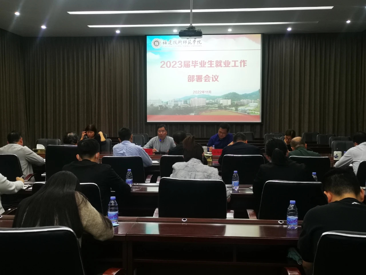 11月15日下午,我校在五马山校区图书馆报告厅收听收看2023届全国普通高校毕业生就业创业工作网络视频会议,并部署推进2023届毕业生就业创业工作。校长廖深基出席会议并作部署讲话。校党委副书记林海峰主持会议。学生工作部、教务处相关负责人,各二级学院就业工作负责人及全体毕业班辅导员参加会议。