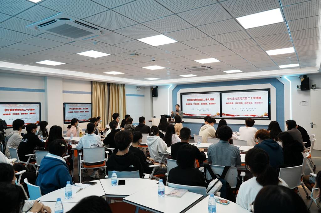 11月22日晚,校党委委员、副校长,校学习宣传贯彻党的二十大精神职业院校宣讲团副团长陈志勇教授走进五马山校区科学楼406智慧教室,为宣讲团成员和学生代表作学习宣传贯彻党的二十大精神专题辅导报告。