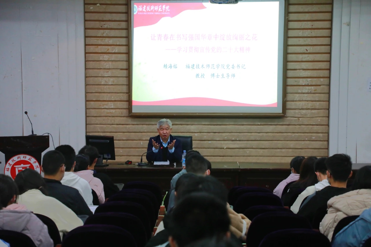 12月7日下午,校党委书记赖海榕教授深入石竹校区,以《让青春在书写强国华章中绽放绚丽之花——学习宣传贯彻党的二十大精神》为题,为2022级计算机科学与技术专业1班、2班全体同学宣讲党的二十大精神。