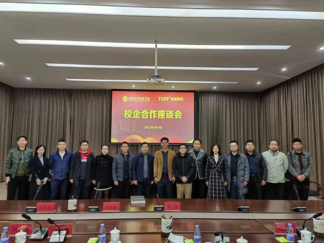 1月11日,拓福集团董事长林云一行莅校开展校企合作对接。校长廖深基代表学校热情接待林云董事长一行。副校长陈志勇,拓福集团副总裁林毅、顾问郑卫、建材总监郭景贵、教育总监林佳佳、体育副总监李渊深、设计经理闫佩龙,教务处、文化传媒与法律学院、教育学院、体育学院、继续教育学院主要负责人和有关教师代表参加了活动。