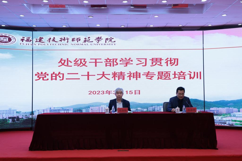 为贯彻落实党中央决策部署和省委工作要求,3月15日下午,我校处级干部学习贯彻党的二十大精神专题培训班正式开班,并在五马山校区科学楼学术报告厅举行首场集中培训。校党委书记赖海榕作了题为《以党的二十大精神为指引 奋力推进学校事业再上新台阶》的辅导报告。报告会由校党委副书记林海峰主持。
