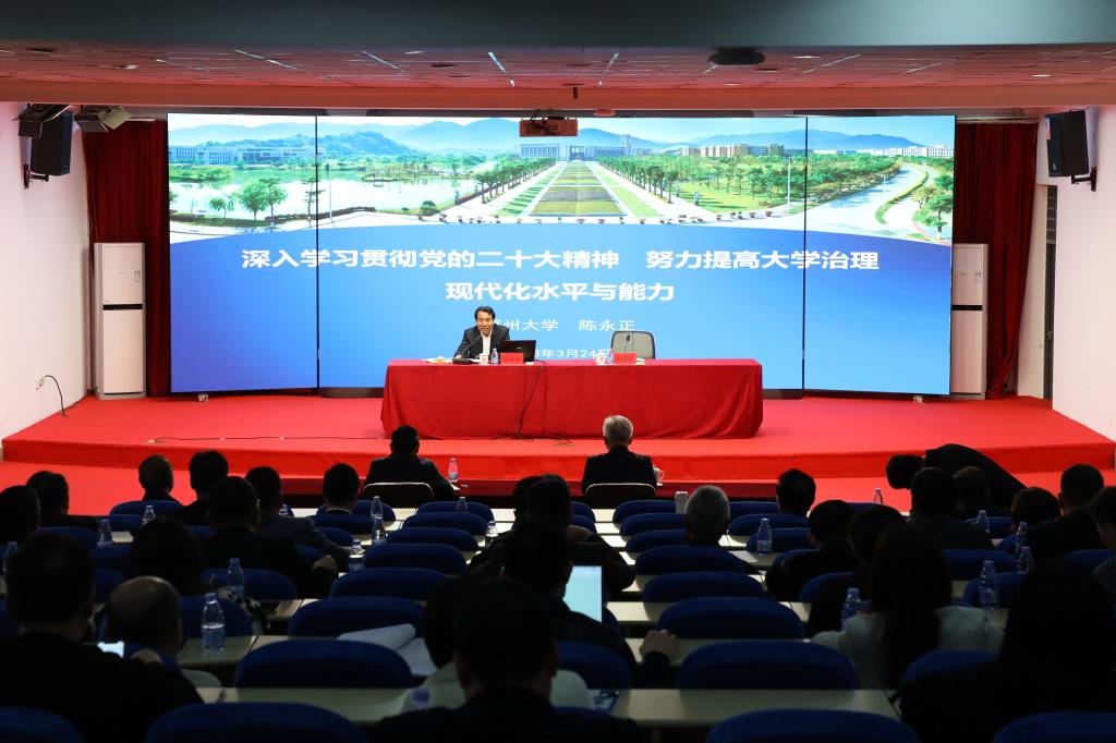 3月24日下午,我校处级干部学习贯彻党的二十大精神专题培训班在五马山校区科学楼学术报告厅开展集中培训,福州大学党委原书记陈永正研究员应邀作了《深入学习贯彻党的二十大精神 努力为大学治理现代化多作贡献》的辅导报告。报告会由校党委书记赖海榕主持。副校长陈志勇、商光美,以及处级干部培训班学员和第二期青年干部培训班学员100多人听取了报告。