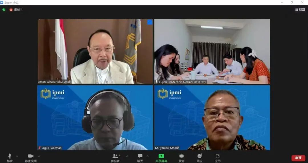 4月17日上午,我校与位于印尼首都雅加达的印尼IPMI国际商学院举行线上会议,围绕服务中印尼“两国双园”项目,联合建立海外职业技能培训中心等工作进行了充分讨论。国际食品科技联盟主席、印尼IPMI国际商学院校长阿曼教授、分管学术副校长马里夫教授、分管国际合作交流副校长洛克曼教授等在线参会。我校副校长、校对接中印尼“两国双园”项目工作专班副组长姜兴山教授出席会议。党政办公室、国际合作与交流处负责人以及工作专班成员等参加会议。